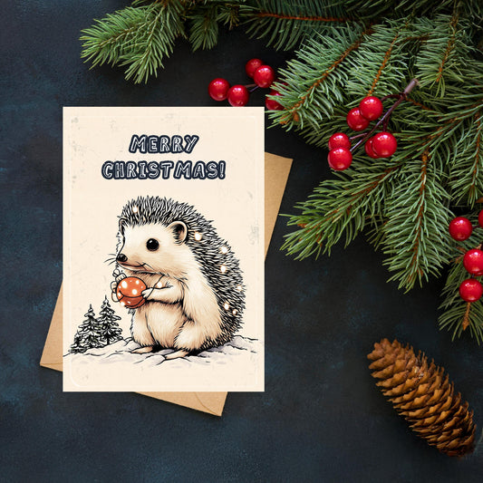 Funny Hedgehog Christmas Card | Cute Winter Holiday Greeting | Funny Xmas Card | Japanese Art Style Holiday Greeting |