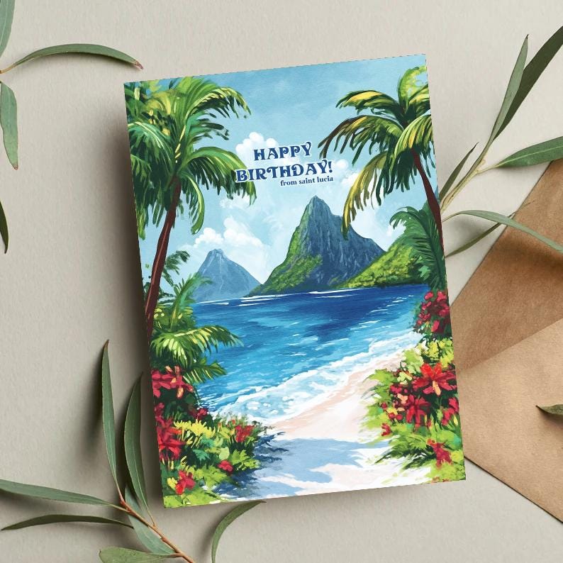 ☀️ Celebrate a birthday with Caribbean vibes! This Saint Lucia Birthday Card captures the tropical beauty and vibrant spirit of one of the most beloved islands in the world. Featuring elements like the iconic Pitons, turquoise waters, palm trees, or colourful island scenes, this card is perfect for island lovers, travelers, or anyone from Saint Lucia.